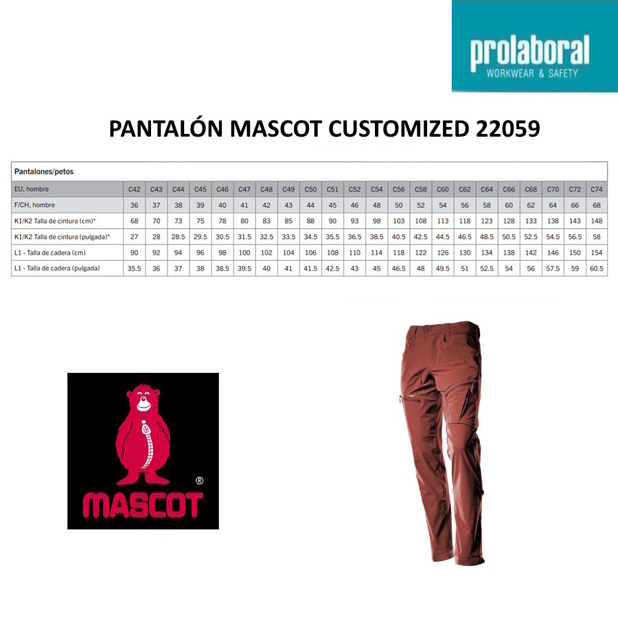• Los productos de Mascot utilizan un sistema de tallas propio que se expresan con códigos como C42, C50, C58.