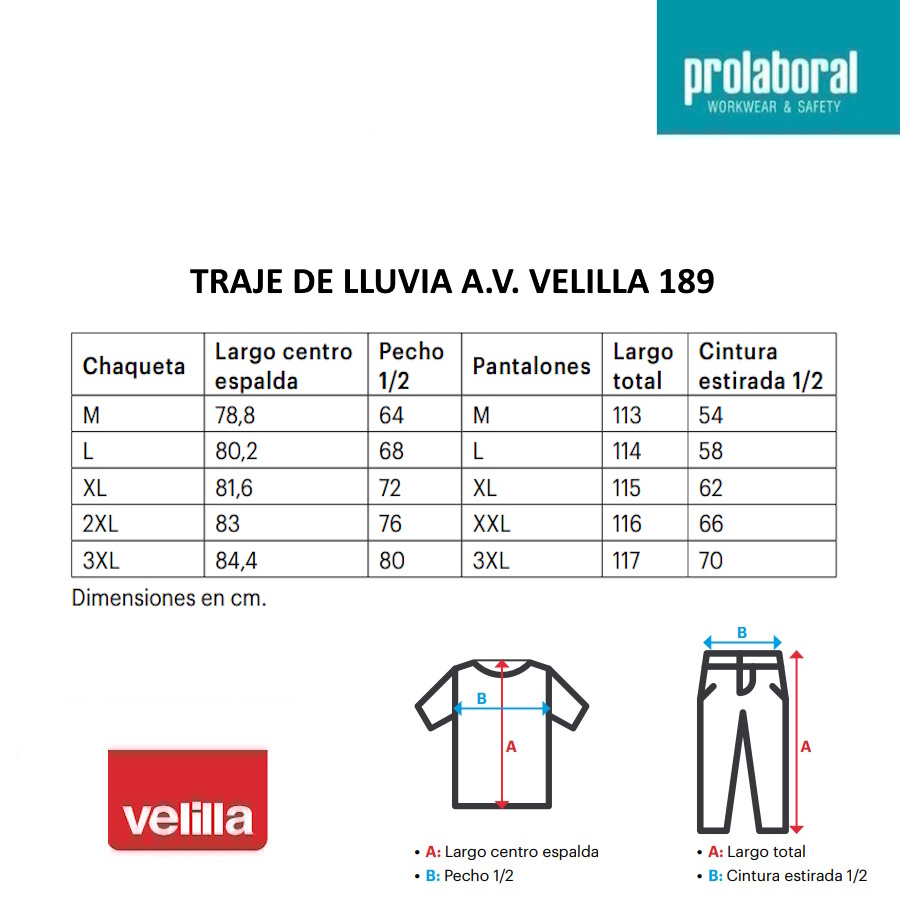 El traje de lluvia A.V. Velilla 189 está confeccionado en poliéster 100% con un gramaje de 130 g/m².