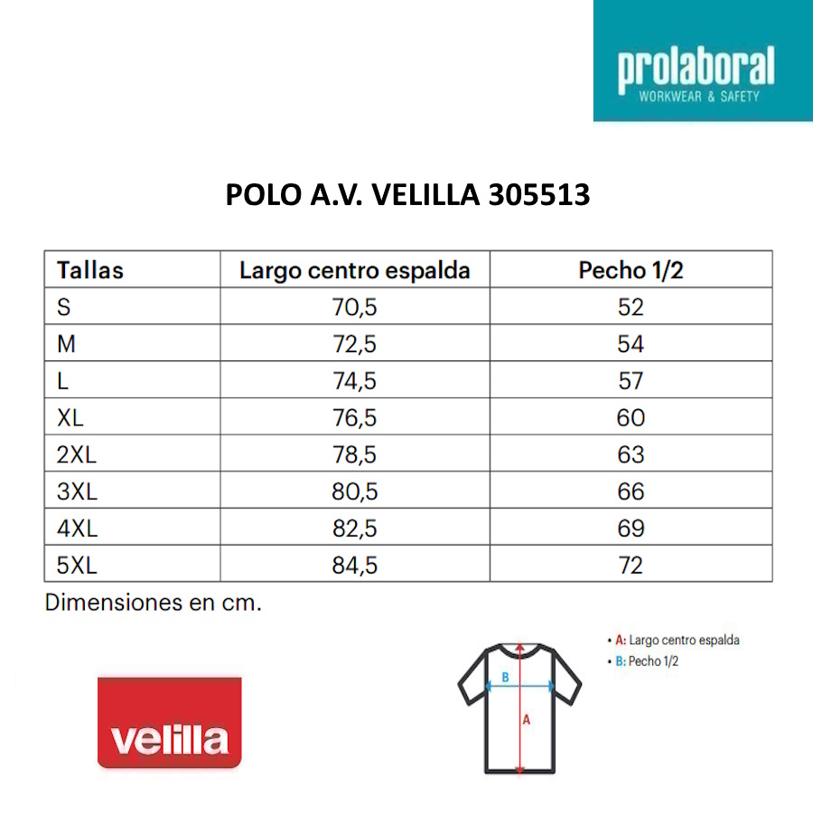 El polo de manga corta Velilla 305513 tiene un cuello y bajo de manga de canalé a contraste, un cierre central con botones y un bolsillo de parche en el pecho. Una de las características más destacables de este polo son las cintas reflectantes en el torso y los colores base fluorescentes, que facilitan la visibilidad en espacios con poca luz o en áreas donde es necesario aumentar la visibilidad para una mayor seguridad.