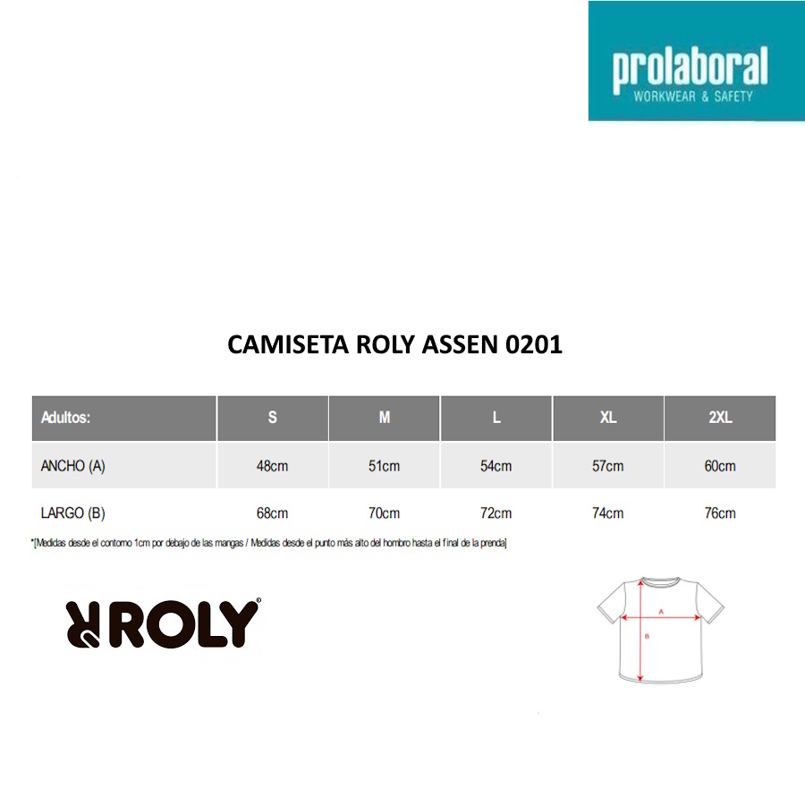 La camiseta Roly Assen es una prenda técnica de manga corta con un diseño clásico de cuello redondo y costuras reforzadas en su interior. Destaca por sus paneles laterales en la parte interna de las mangas y los hombros, que están remallados en el mismo tono de la camiseta.