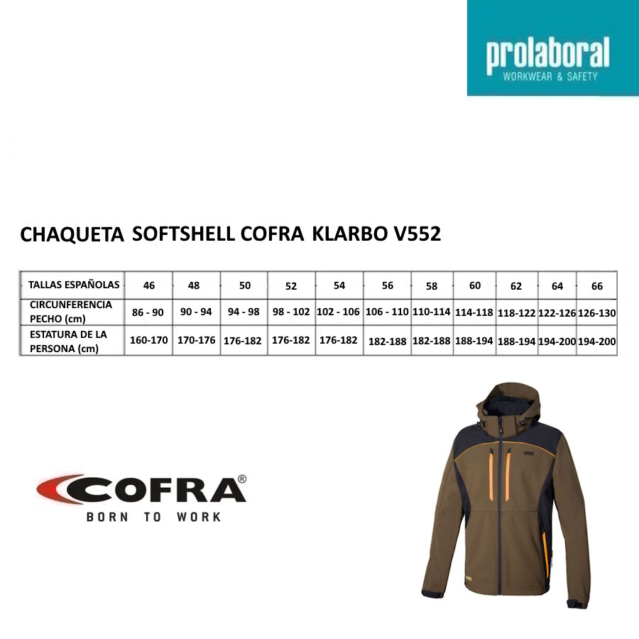 - Softshell 94% poliéster, 6% elastán + membrana COFRA-TEX.